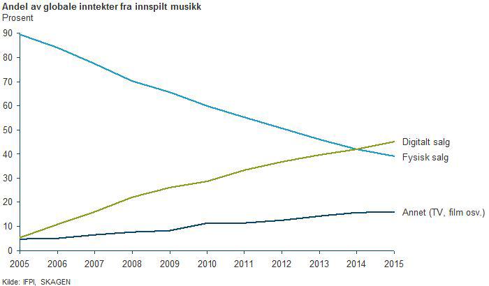 Men der Napster og iTunes representerte en umusikalsk utvikling i industriens ører, er tonene bedre når det kommer til Spotify og de andre strømmetjenestene. I 2015 så vi nemlig, for første gang siden 1990-tallet, en anstendig økning i salget av innspilt musikk. Til tross for at inntektene fra både fysisk salg og nedlastninger fortsetter å falle, var veksten i betalende abonnenter hos strømmetjenestene nok til å kompensere for nedgangen. Dette resulterte i en global salgsvekst på 3 prosent i forhold til 2014.