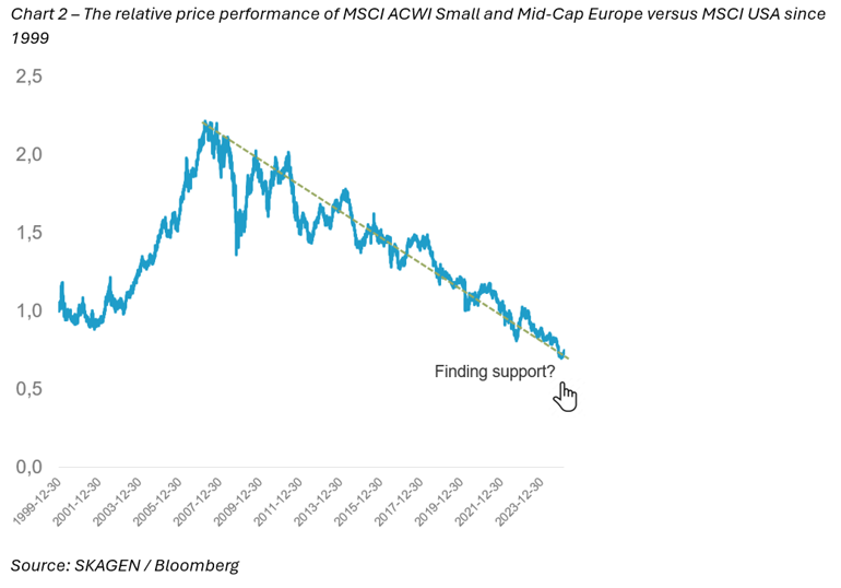Vi har vært gjennom en interessant periode som har vart i nesten 20 år, der amerikanske aksjer har overgått de europeiske small- og mid-cap-selskapene. Verdsettelsesforskjellen mellom de to markedene var på et svimlende nivå, spesielt for de største amerikanske selskapene, noe som skapte et uvanlig investeringsklima.