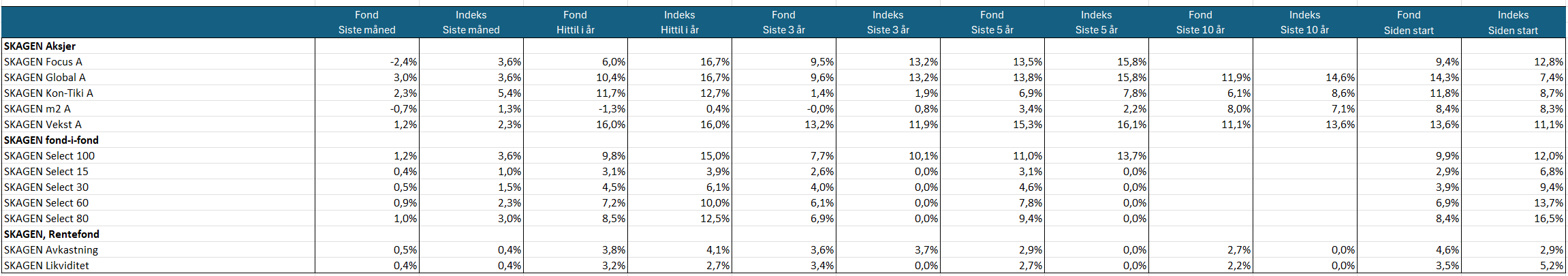 Klikk på tabellen for en større versjon. Perioder over 12 mnd viser gjennomsnittlig årlig avkastning.
