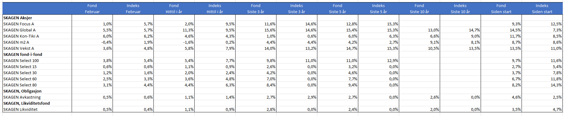 I løpet av februar opplevde vi nok en hendelsesrik måned på de globale aksjemarkedene, noe som også hadde innvirkning på SKAGENs aksjefond. Fire av våre fem aksjefond oppnådde solid absolutt avkastning, mens et av fondene opplevde en liten nedgang.