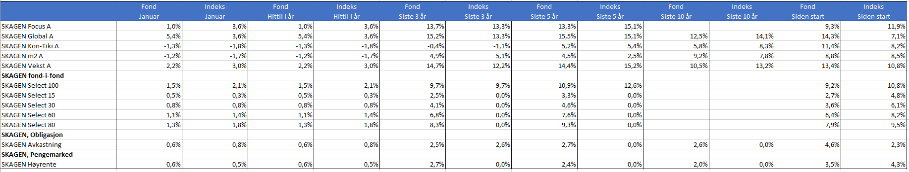 SKAGEN Global slo referanseindeksen i januar med en avkastning på 5,4 prosent mot indeksens 3,6 prosent. Ved utgangen av måneden hadde fondet bedre avkastning enn sin referanseindeks, målt over periodene siden årsskiftet, de siste tre årene, de siste fem årene, og siden fondets start. Flere avkastningstall nederst i artikkelen.