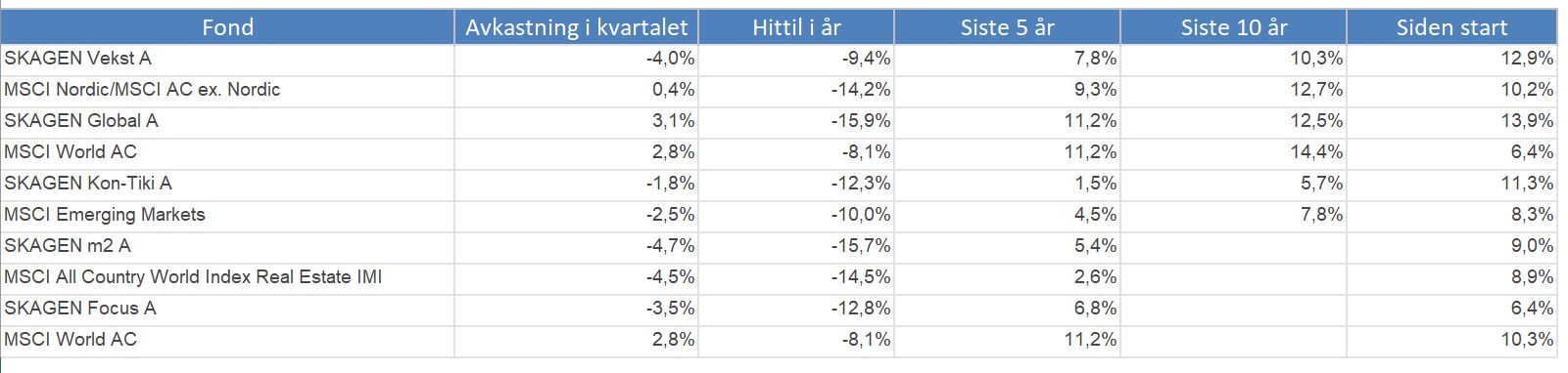 Det nordisk-globale aksjefondet SKAGEN Vekst avsluttet kvartalet etter referanseindeksen, en kombinasjon av MSCI Nordic og MSCI AC ex. Nordic. I perioden falt fondet 4,0 prosent mot indeksen som steg 0,4 prosent. For flere avkastningstall se tabellen nederst i denne artikkelen.