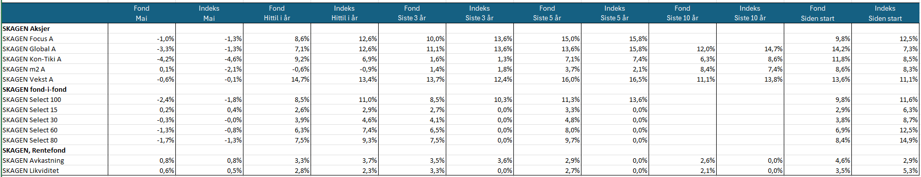 Det nordisk-globale aksjefondet SKAGEN Vekst falt 0,6 prosent i mai, mens indeksen falt 0,1 prosent. Se flere avkastningstall nederst i artikkelen.
