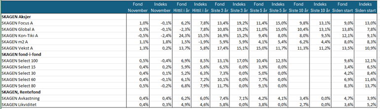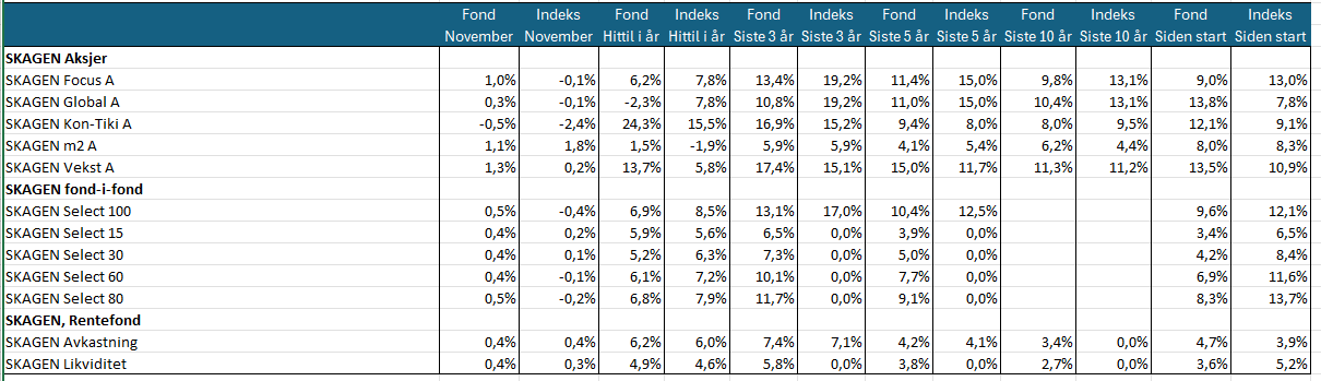 Stemningen snudde positivt mot slutten av måneden da rentekutt igjen ble priset inn i USA og fredshåpet i Ukraina tiltok. SKAGEN Vekst leverte sterk avkastning og oppnådde 1,3 prosent i november, mens indeksen steg 0,2 prosent i måneden. Se flere avkastningstall nederst.
