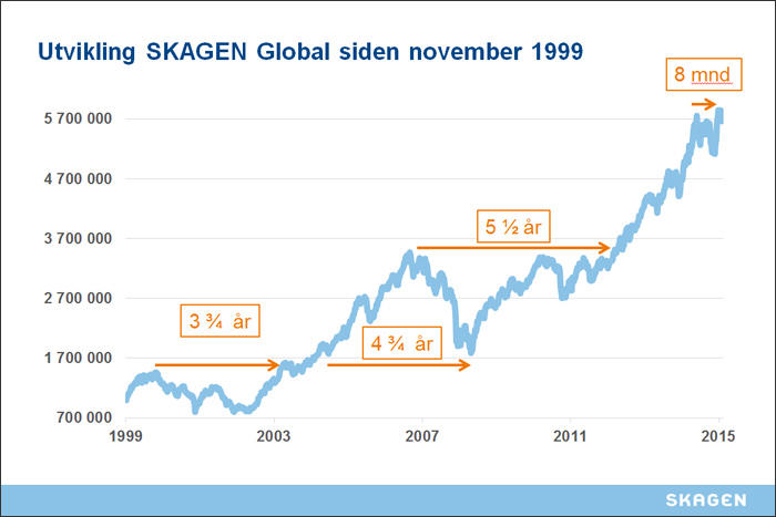 Avkastningen i hele denne perioden grafen viser, har vært upåklagelig, men ikke uten tålmodighetsprøver. Fra juli 2007 måtte du vente helt til februar 2013 før du hadde fått tilbake ditt innskudd, dersom du plasserte en engangssum.