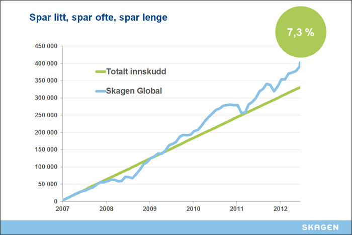 Altså: Årlig avkastning med engangsinnskudd fra juli 2007 til februar 2013 ville gitt 0 prosent. Spareavtale i samme periode ville gitt årlig avkastning på 7,3 prosent.