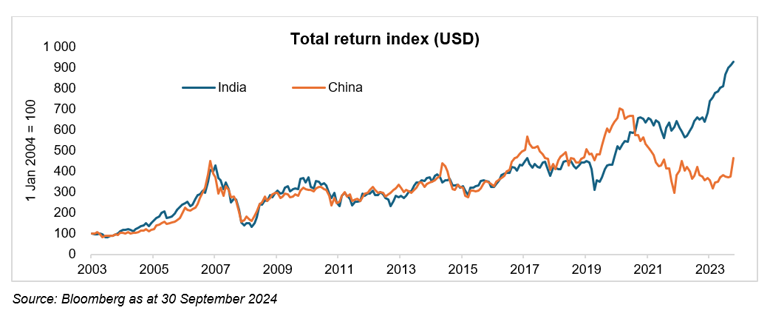 To start with the obvious, investor sentiment clearly suffers from recency bias of news flow and financial performance. While we have written extensively about the challenges (and opportunities) of the Chinese equity market over the last five years, its performance has left much to be desired. India, on the other hand, has been one of the better performing global stock markets over the last five, ten and twenty years.