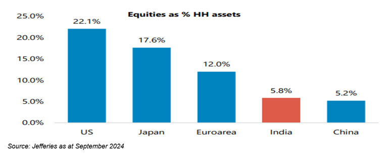 India, on the other hand, already has a well-established equity ownership culture, which accounts for 6% of household assets compared with 5% in China and 12% in the Euro Area. Whilst the comparison to more developed countries suggests there is a long runway for rising equity ownership, the change in India has also been very rapid. Prior to the recent equity bull market, the average Indian household allocated just 1% of incremental savings into equities in FY14-17, according to Jefferies. By 2024, this figure has risen to 7%, suggesting a material change in appetite for equity investing.