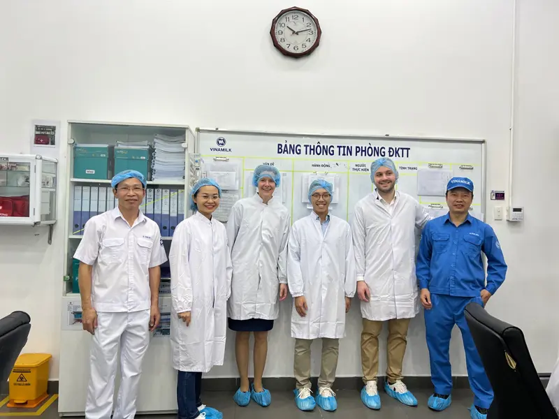 Our first meeting was with the largest diary company in Vietnam, Vina Milk. They presented their largest manufacturing site, where milk is loaded, processed, packaged, and warehoused. 140 000 cows, of which 40 000 are owned by Vina Milk, are regularly massaged and showered. Chips in their ears show their overall well-being and store data that may be further processed using AI or machine learning in the future. The factory was modern, with 70% of energy sourced from renewables.