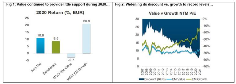 SKAGEN Kon-Tiki ended 2020 a little over 2% ahead of the MSCI EM index, a particularly strong result given the value factor provided a continued headwind for the fund's investment style and underperformed the growth equivalent by the widest margin since the dot com bubble (see figure 1). November proved pivotal, however, as vaccine breakthroughs and the US election result saw value rebound. Kon-Tiki rode the recovery to beat the MSCI EM index by over 7% in the final quarter, which illustrates the portfolio's latent potential and bodes well if value maintains its revival.