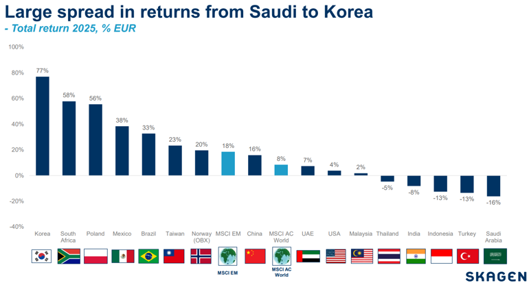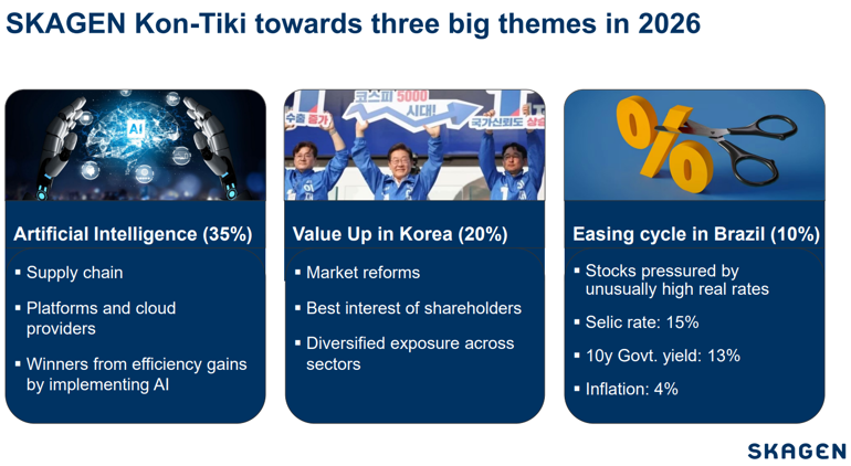 Emerging markets’ strong performance has carried into 2026, driven by continued momentum from semiconductor stocks in Korea and Taiwan plus a rebound in Brazil, and SKAGEN Kon-Tiki’s portfolio is well-positioned for these themes.