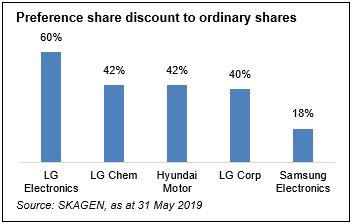 Kon-Tiki’s largest divergence currently is its overweight exposure to Korean companies (24% of the fund vs. 12% of the MSCI EM index), which illustrate how mispriced stocks can deliver attractive returns. Our largest holding is Samsung Electronics (8.4% of NAV), which continues to deliver impressive financial performance and shareholder returns but remains valued at a significant discount to global peers. Despite producing world-class products, Korean companies are often undervalued due to perceptions of weak corporate governance and poor capital allocation but where treatment of minority shareholders is improving. Another example is Hyundai Motor (4.5% of NAV) which has launched a governance charter and is taking steps to increase dividends and simplify its chaebol structure. Finally, investors can access Korean companies via preference shares, which typically trade 20% to 60% below ordinary shares (see chart), with the most attractive discount currently on offer at LG Electronics (3.7% of NAV) where we potentially see 140% share price upside.
