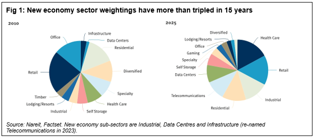 These themes have transformed the listed real estate landscape in recent years as REITs have led the way in resilience. New economy sectors – telecommunications, data centres and industrial – have been the fastest growing listed real estate segments alongside healthcare, rising from less than 10% of total AUM in 2010 to almost a third in 2025.