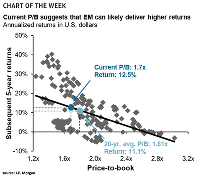 As equity investors, history tells us that valuation is a strong indicator of returns. Before the latest sell-off, emerging markets traded at 1.7x P/B which since the turn of the century has been followed by average 5-year annualised returns of 12.5% (see figure 2 below)[3]. This has now fallen to 1.5x while the SKAGEN Kon-Tiki portfolio is cheaper still, trading at a weighted P/B of 0.9x, signalling the potential for significant gains ahead.
