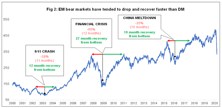Global equities, as measured by the MSCI World Index (EUR), fell by a third between their mid-February highs and March lows. The benchmark has plunged into similar bear markets (>20%) three times in the past twenty years. First, in 2002 following the dot-com bubble, 9/11 attacks and US accounting scandals, the index fell 44% over a 12-month period. From its low point in March 2003 it took 35 months to fully recover these losses (see figure 1 below).