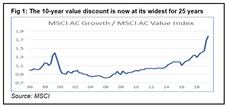 History also teaches us that when the growth to value spread has been at levels close to today's – the MSCI World Growth index P/B is over double that of the value equivalent and its P/E more than three times higher – value outperformance follows. For this not to happen again, growth stocks would need to deliver further earnings growth or interest rates used to discount future earnings would need to fall further, both of which seem unlikely.