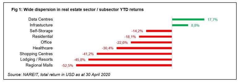 With around half the world's population forced to stay at home in April, it is no surprise that property usage has been severely impacted by the coronavirus. Government closure of commercial premises has decimated high streets around the globe and seen real estate – traditionally a haven for investors during market stress – underperform global equities in the current crisis.