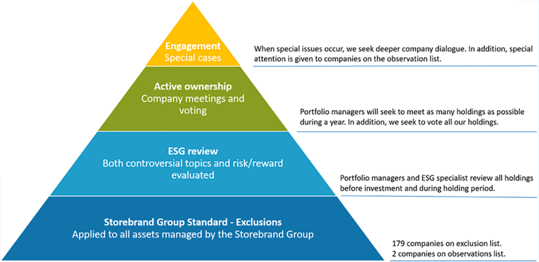 We believe active ownership means engaging and creating a dialogue with companies in order to influence them to make small or large improvements. Exclusion are used as a last resort as it means we no longer will have the power to influence the company.