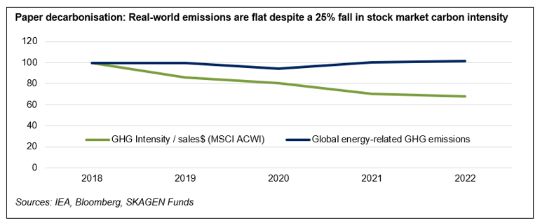 Many of the supposed ESG leaders are technology companies which are asset-light but where less visible emissions from things like data centres, servers and electronic waste put the sector’s overall environmental impact on a par with the aviation industry. As these companies have grown increasingly weighty in global stock markets (the tech sector now represents a quarter of the MSCI ACWI Index), so carbon intensity measures have fallen while real-world emissions – which unfortunately can’t be outsourced or passed along the supply chain – have remained flat.